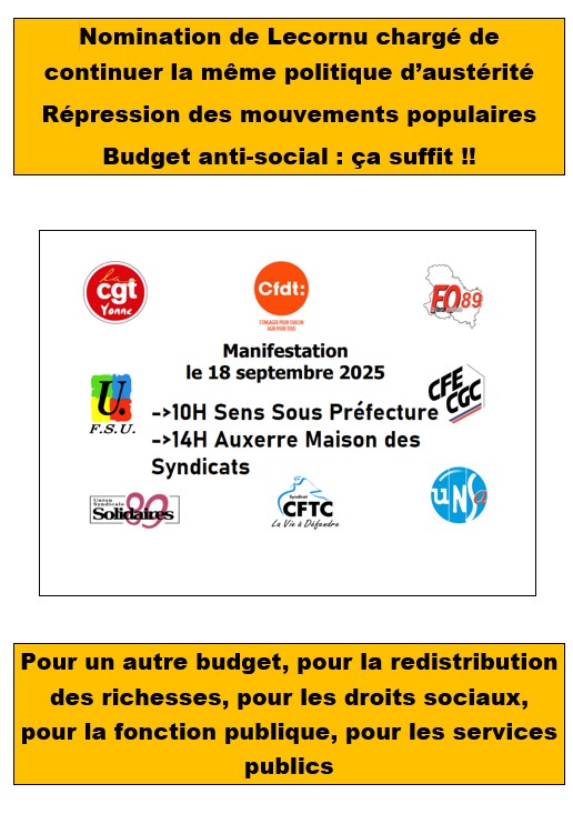 Appel intersyndical à la grève du 18 septembre 2025 15 septembre 2025 snetaa-FO Dijon Vous trouverez ci-dessous les tracts d’appel à la grève du 18 septembre National : IS Educ 1809 vdef Côte d’Or : Tract intersyndical Côte d’Or 18 SEPTEMBRE Yonne :